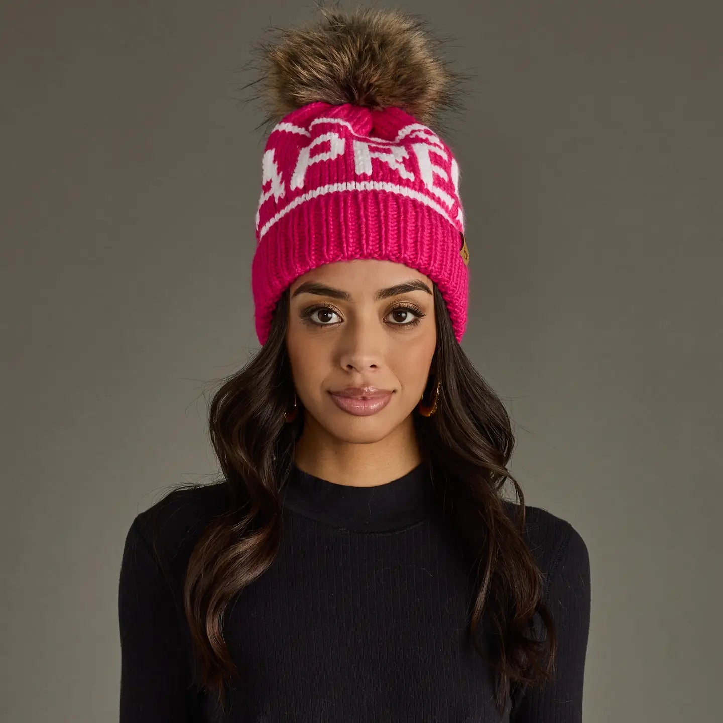 Top off your winter look with this cozy knit hat featuring a soft faux fur pom that adds just the right amount of flair. The fleece lining keeps you warm and comfy all season long, while the cuffed hem and crown patch detail give it that elevated mountain-town feel.