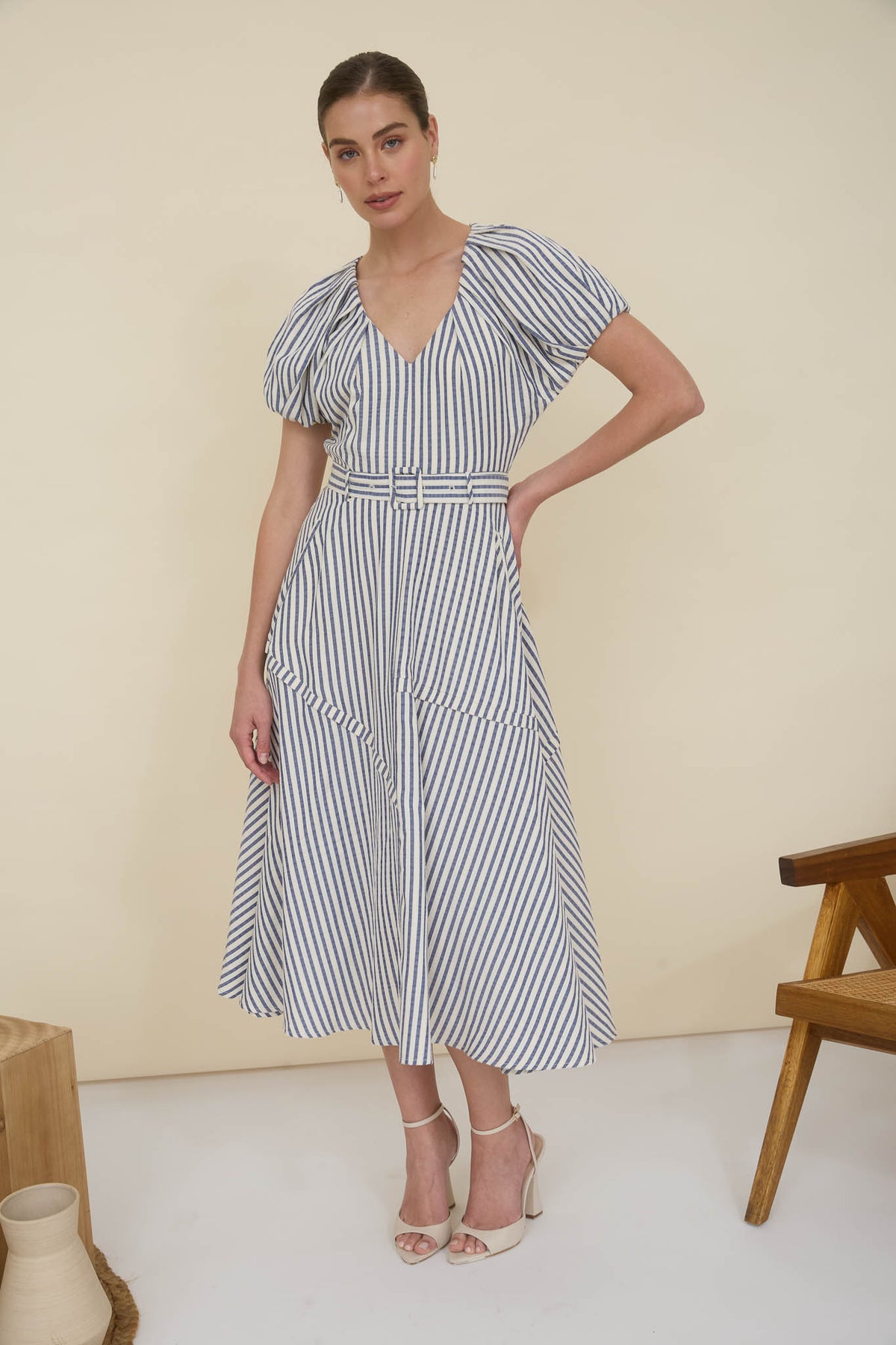 Navy Strip Puff Sleeve Dress