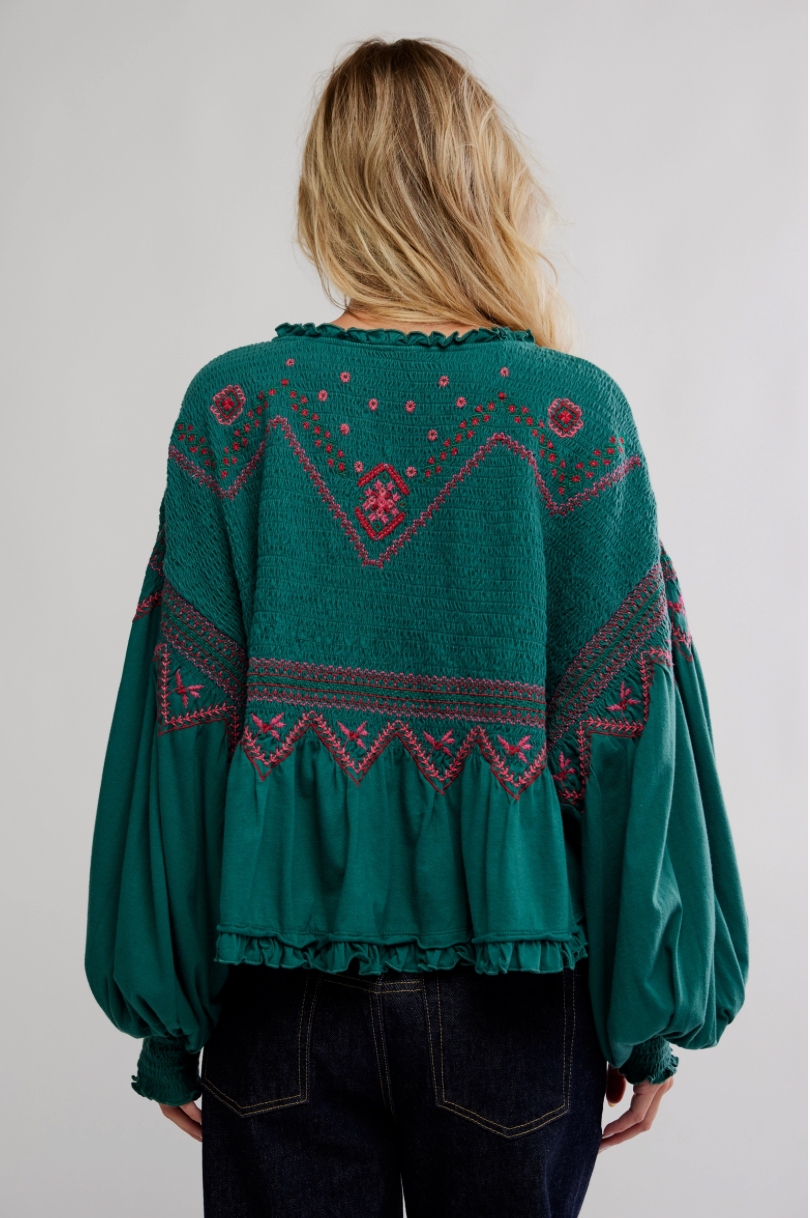 intricate embroidered detail across the chest and sleeves