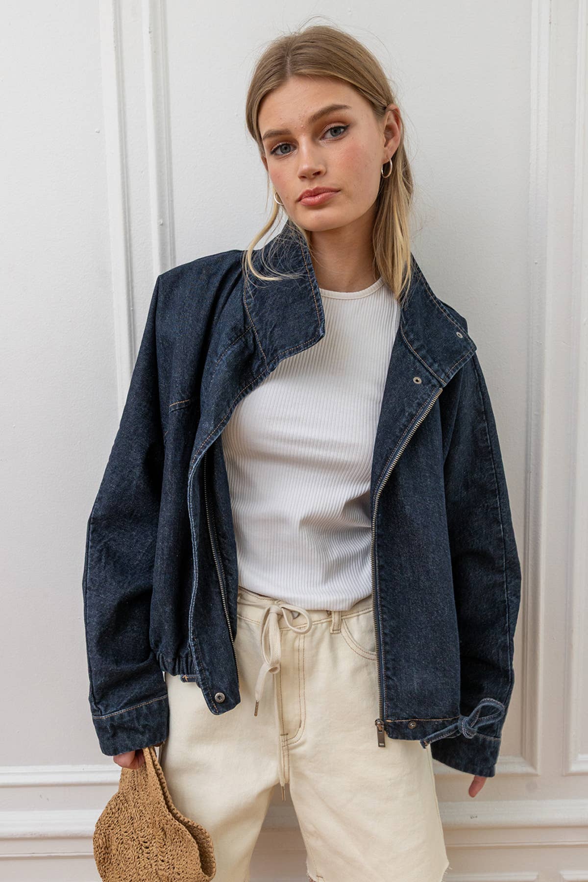 High Neck Drawstring Hem Denim Jacket